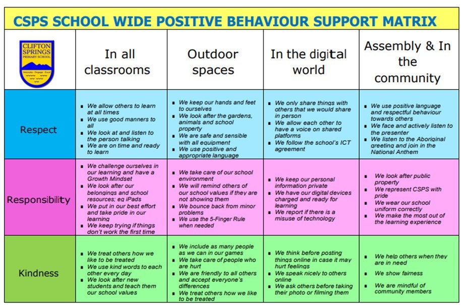 The social emotional learning program has been called SHINE and we have a SWPB (school wide positive behaviour) matrix that resulted from a long consultation in recent years. Students have been becoming familiar with the school’s expectations as listed in the Behaviour Matrix as an introduction to the 2026 school year to encourage a safe and supportive learning environment. We are in the process of reviewing the matrix and will ensure students, staff and parents have input into the 2026 version of the matrix. We are following the DET Vic new recommendations for the Positive Classroom Management Strategies.