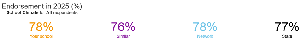 All staff had the opportunity to participate in the State Staff Survey. We have a high number of staff highly endorsing the school this year, as they have done so in previous years. The results are higher than similar schools in the local area and the state.